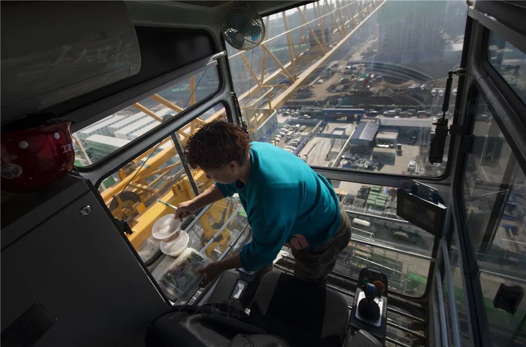 ▲12月4日中午,塔吊队长王凤敏在驾驶舱内吃午饭。自5月进场施工以来,由于工期紧任务重,连班上的时候,王凤敏会把午饭吊上来。