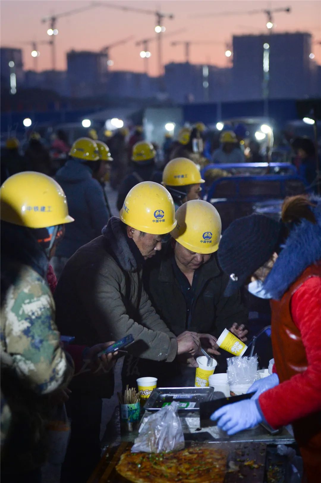 ▲12月4日黎明,在容东片区E组团安置房项目部不远处,工人们排队购买早餐。