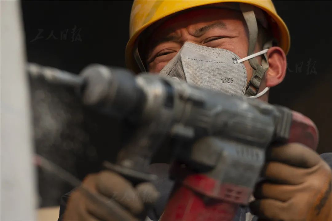 ▲12月6日,一名电钻工人戴着KN95口罩作业。