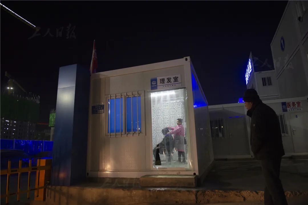 ▲12月4日晚,几名工人在职工宿舍内的理发室剪头发,一次8元。