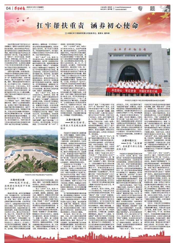 12月11日出版的《学习时报》整版刊发中国化学工程集团有限公司党委书记、董事长戴和根的署名文章《扛牢帮扶重责 涵养初心使命》。全文如下: