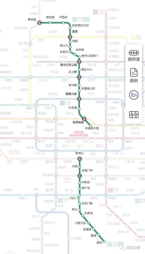 在地铁线路图中,位居正中的地铁8号线,基本与北京中轴线重合,是线网规划中南北走向的骨干线路。