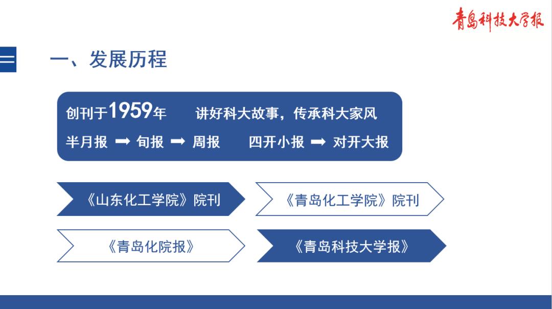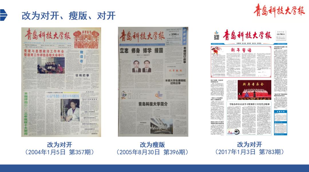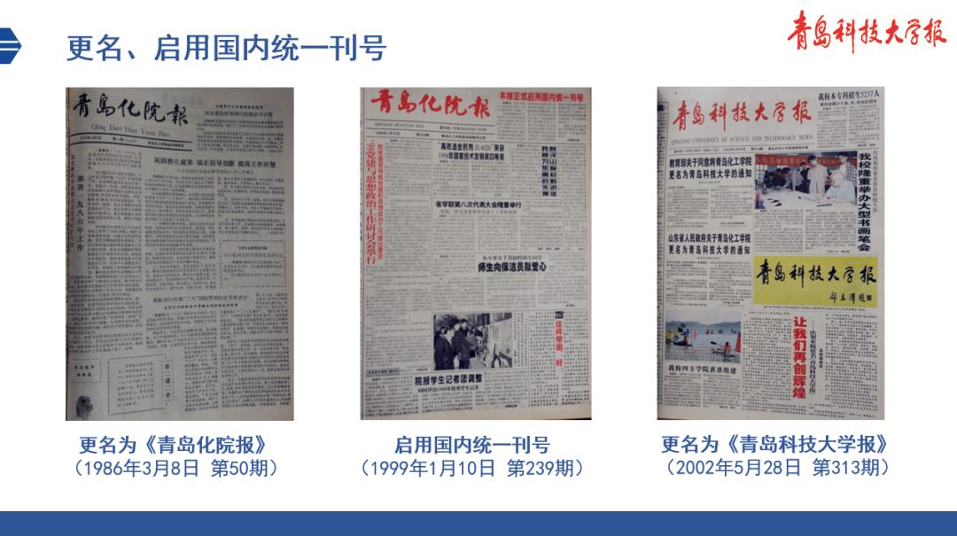 据悉,《青岛科技大学报》是青岛科技大学党委主办主管的学校党政机关报,是山东省高等学校优秀校报。《青岛科技大学报》创刊于1959年1月27日,当时为《山东化工学院》院刊,1984年9月更名为《青岛化工学院》院刊,1986年3月更名为《青岛化院报》,2002年5月28日第313期更名为《青岛科技大学报》,时任中国新闻工作者协会主席邵华泽为《青岛科技大学报》题写了报名。《青岛科技大学报》经历了从半月报到旬报再到周报、从四开小报到如今的对开大报演变过程。如今的《青岛科技大学报》为对开4版彩印周报,每周二出版,每周三发行,国内统一刊号为CN37-0820/(G),每期发行量1万份。