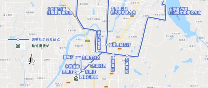 (3)即墨13路由“服装市场—即城界”调整为“服装市场—西郭庄社区”,接驳东郭庄地铁站。