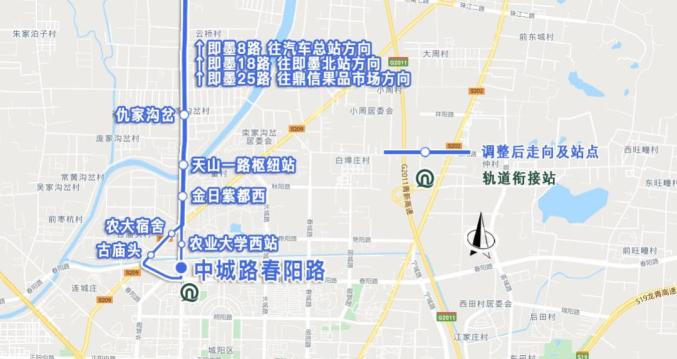 (5)即墨25路由“鼎信果品市场—天山一路枢纽站”延伸为“鼎信果品市场—中城路春阳路”,接驳农业大学地铁站。