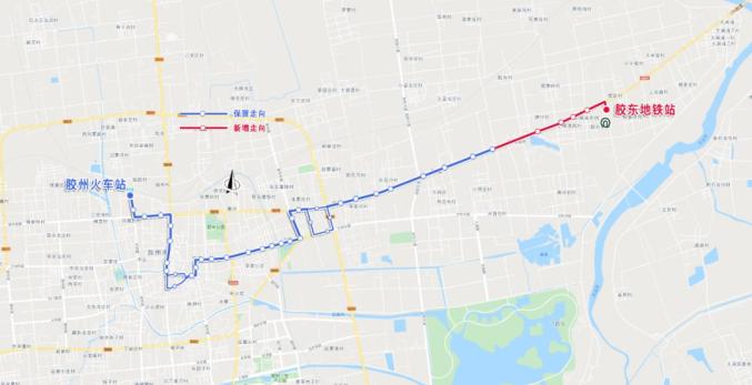 线路走向:自胶州火车站始发站,往返沿原线路至胶东医院站后,再沿G204、营旧路至胶东地铁站止。