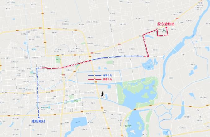 线路走向:自康明眼科始发站,往返沿原线路至羽柃珊纺织品站后,向北直行至G204、机场高速西侧路、胶州四中、营旧路至胶东地铁站止。