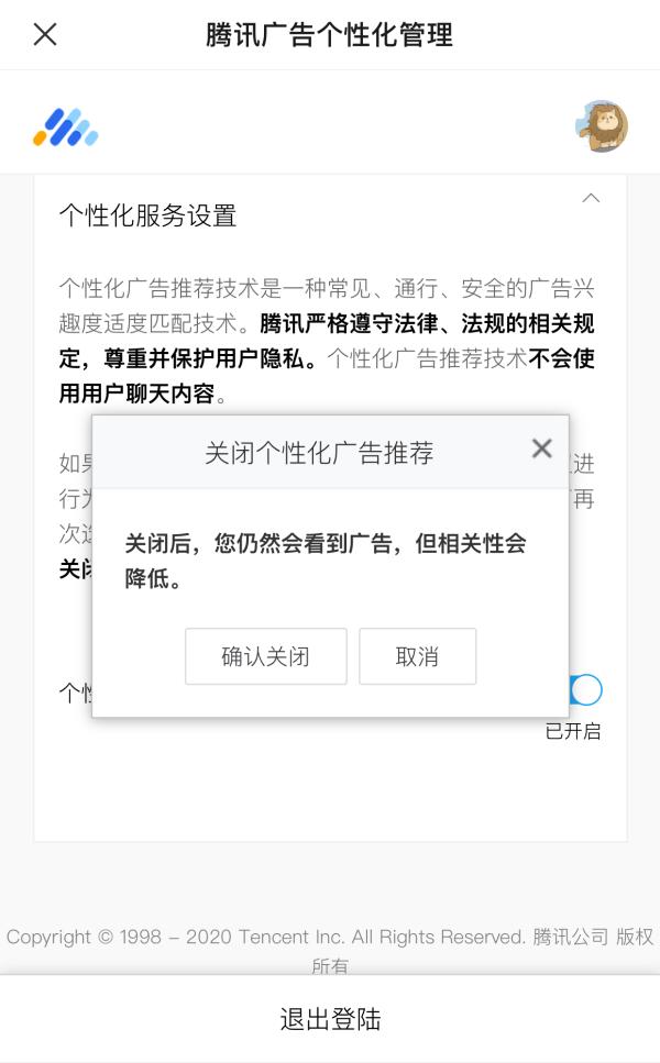 点击关闭个性化广告按钮后,微信弹窗显示“关闭后,您仍然会看到广告,但相关性会降低”。 微信截图