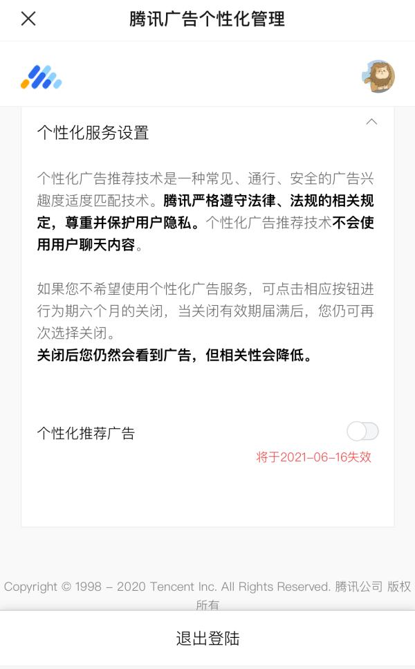12月16日,记者关闭“个性化推荐广告”后,红色小字显示关闭操作将于2021年6月16日失效。微信截图