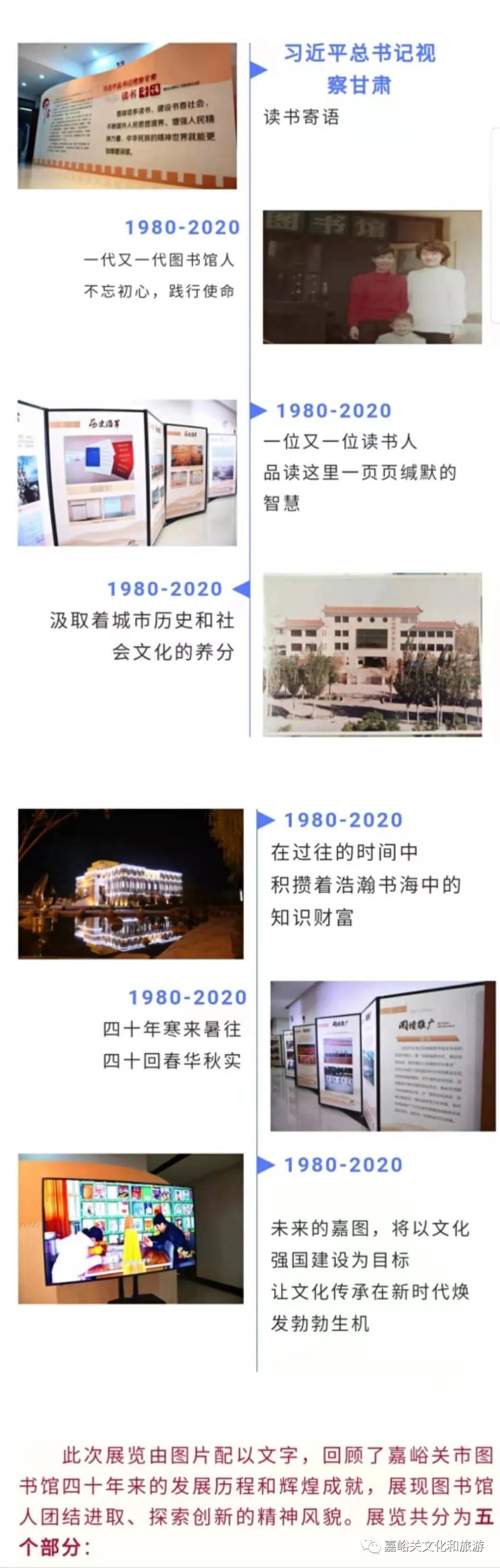 迎着十四五的文化征程,嘉峪关市图书馆特举办“建馆40周年”图片展,让图书馆人和广大读者一起,回望历史,缅怀过去,凝心聚力,扬帆启航!