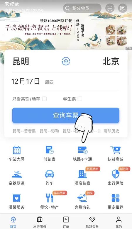 为进一步方便旅客出行,自12月16日起,昆明局集团公司在昆明南—玉溪间C、D字开头始发终到的动车组列车,昆明—宣威、昆明—曲靖、宣威—曲靖间C字开头的始发终到动车组列车,正式开通“铁路e卡通”扫码乘车业务。