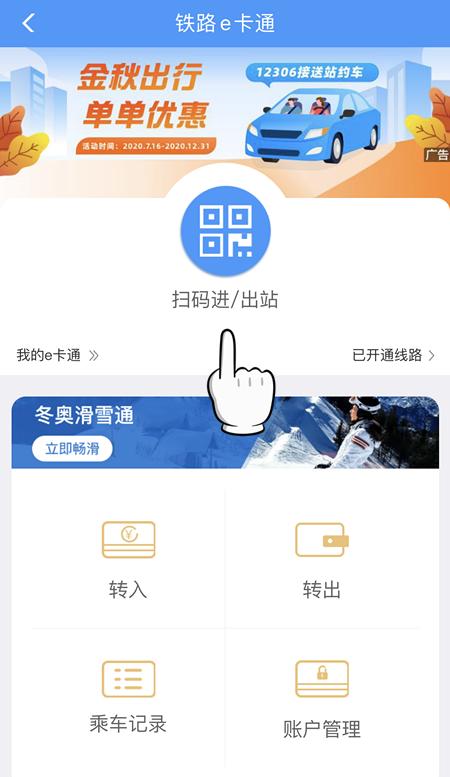 旅客登陆铁路 12306 手机客户端,进入“铁路 e卡通”界面,在线完成信息填写和二代居民身份证的人证比对后提交申请,开通“铁路 e 卡通”账户并与12306本人账户绑定后,即可在铁路 12306 手机客户端生成动态二维码,使用该二维码自助扫码进出站。