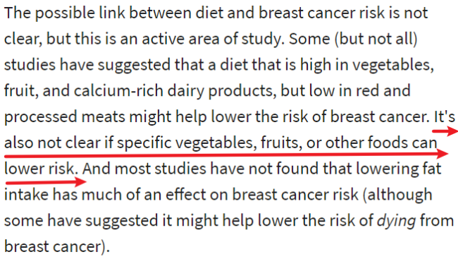 按照美国癌症学会的说法,目前还不清楚特定的蔬菜、水果或其它食物能否降低乳腺癌风险。