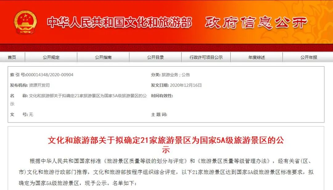 根据中华人民共和国国家标准《旅游景区质量等级的划分与评定》和《旅游景区质量等级管理办法》,经有关省(区、市)文化和旅游行政部门推荐,文化和旅游部按程序组织综合评定,以下21家旅游景区达到国家5A级旅游景区标准要求,拟确定为国家5A级旅游景区,现予公示。名单如下: