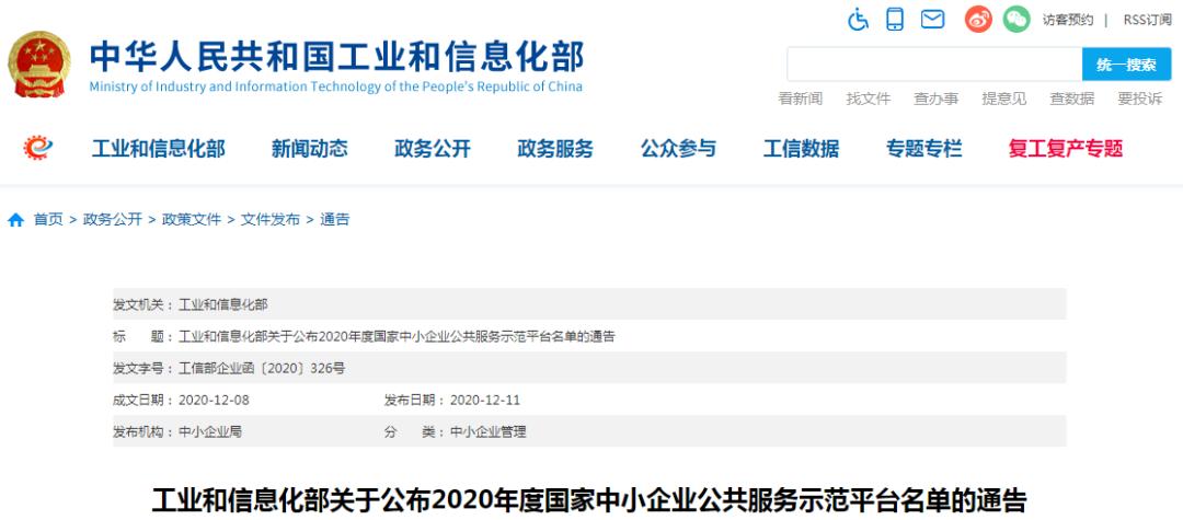工业和信息化部关于公布2020年度国家中小企业公共服务示范平台名单的通告