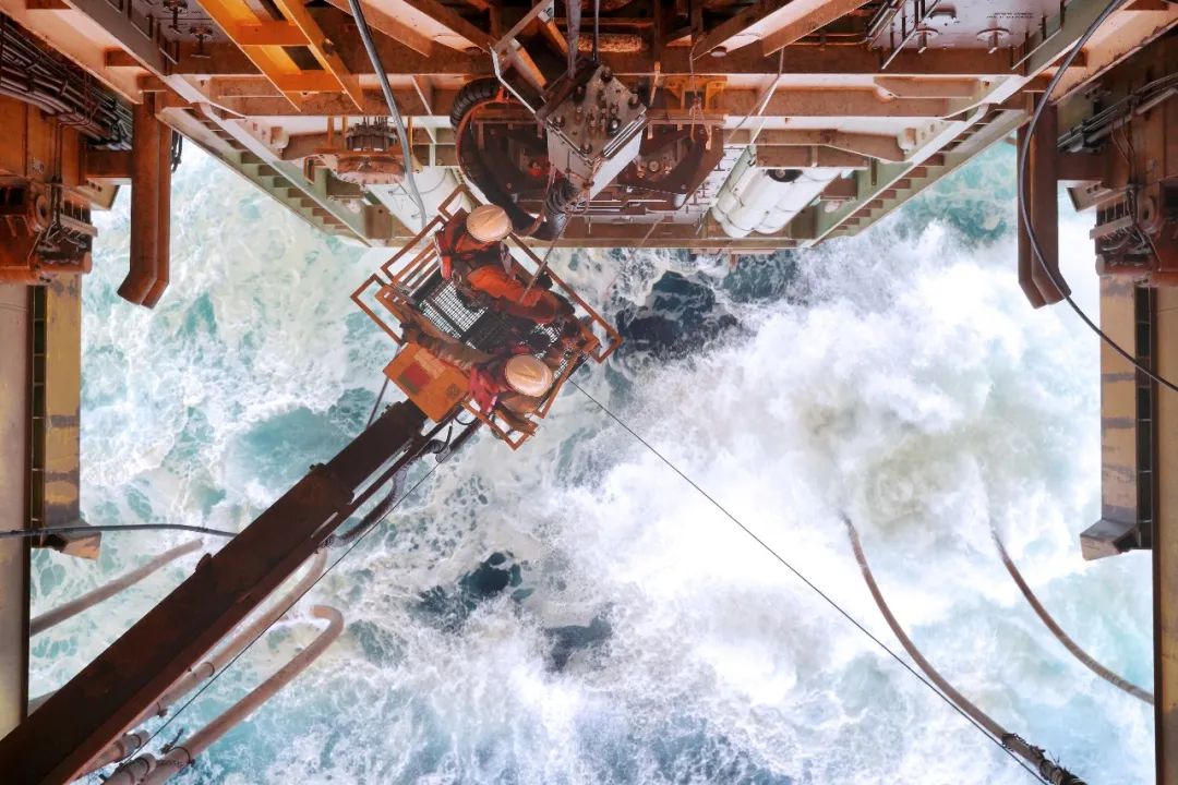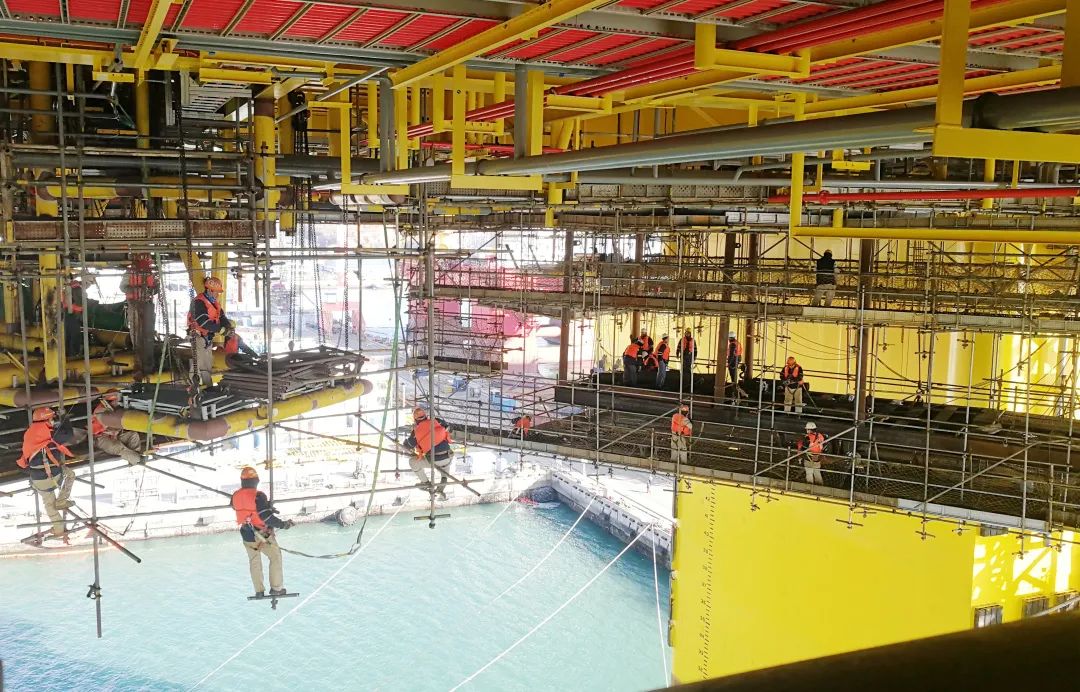 平台完成合龙后,悬空固定在平台底部的SCR滑轮距离海平面近60米,在所有吊机设备都用不了的情况下,需要施工人员在距离海平面近60米的高空,架起一座长15米、宽4.7米的临时平台,在上面铺设一条导向轨道,然后再使用滚轮小车将SCR滑轮滑移15米至安装点,整个作业过程“步步惊心”。