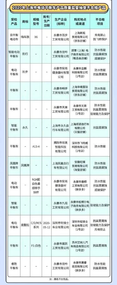 据上海市市场监管局17日消息,近期,上海市市场监管局对上海市销售的20批次电动平衡车进行了监督抽查,发现不合格产品13批次,不合格项目主要是防水性能、抗盐雾腐蚀、超速保护、驻坡能力及保护、充电锁止和防飞转保护,涉及嗨车族、豹行、比步、永久、凤凰、麦酷拉等品牌。