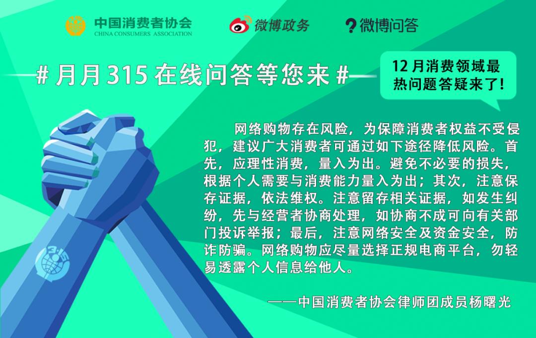 为进一步做好消费维权工作,加强与消费者互动,为消费者提供有效咨询渠道,了解掌握消费热点难点,中消协联合新浪微博,开展“月月315在线问答等您来”咨询服务活动。详情请见:月月315|中消协律师团律师在线答疑等您来!一起来看本月315答复要点!