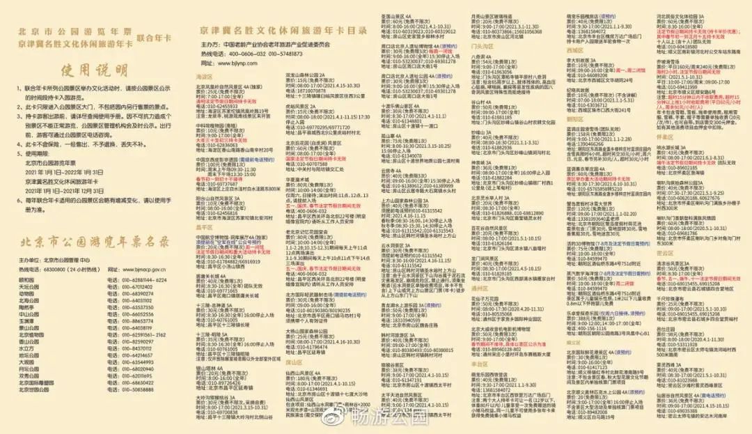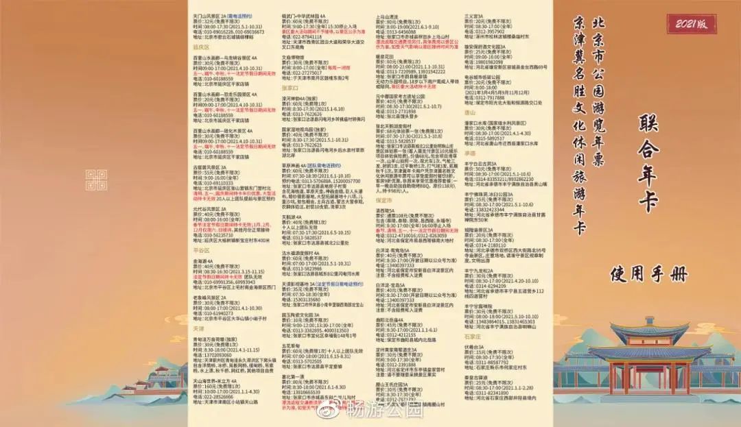 上述年票17家公园,及“京津冀名胜文化休闲旅游年卡”所涵盖的景区,包括北京蟒山国家森林公园、妙峰山、李大钊故居、金海湖,以及天津文庙博物馆,张家口国家湿地观鸟园、唐山景钟山等。(“京津冀名胜文化休闲旅游年卡”所涵盖的景区以使用手册标示的时间为准)