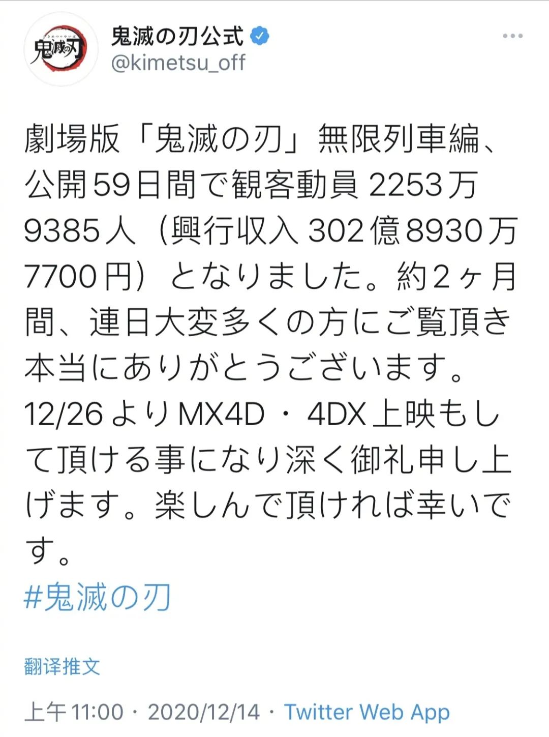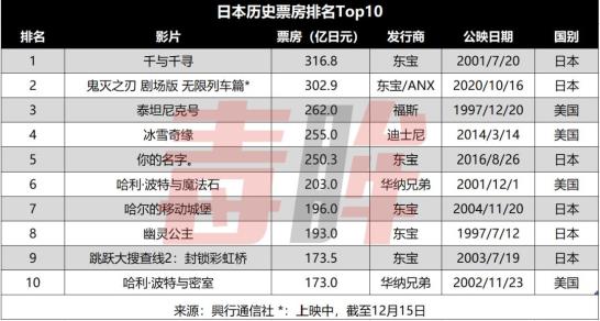 《鬼灭之刃》也是自2001年宫崎骏的《千与千寻》之后,第二部在日本市场突破300亿大关的影片。