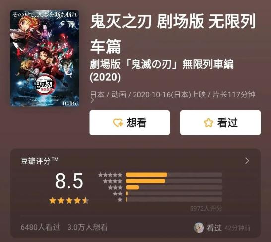 作为首部登陆大银幕的剧场版,《鬼灭之刃》的先期口碑相当出色,在豆瓣上目前有逾5千人打出8.5分,IMDb网站也达到8.3分(2225人评分)。本月初,《鬼灭之刃》剧场版还获得第45届“报知电影奖”等褒奖,制作品质同样获得行业认可。
