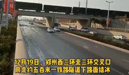 2)12月19日,郑州西三环北三环交叉口向北约五百米以铁路隧道下路面结冰。现场交警表示附近一工地运输物料弄脏了路面,路面用水清洗导致结冰。结冰路面导致数辆机动车发生事故。提醒过往司机请小心通行!