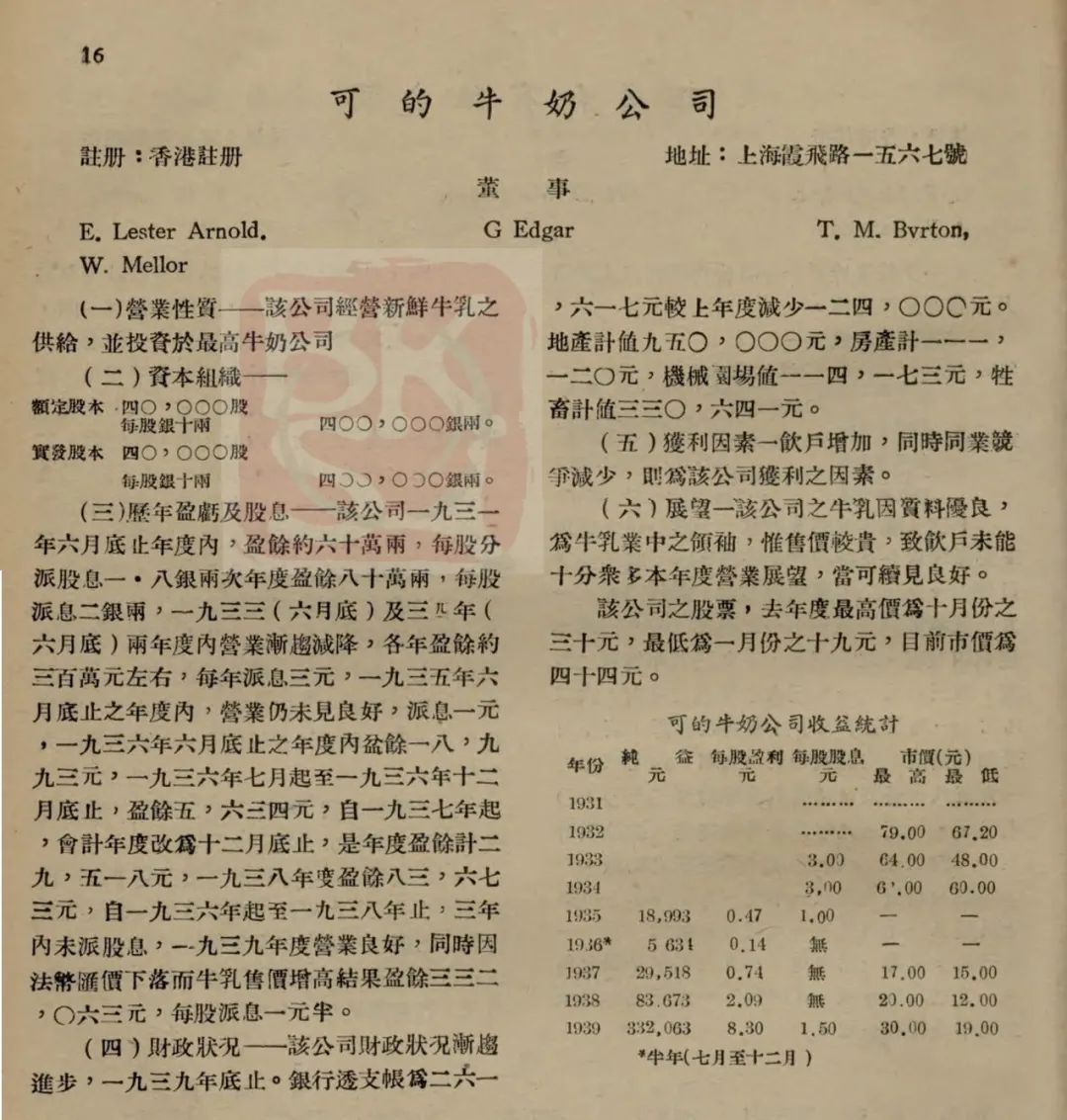 20世纪30年代,可的公司又引进机械化挤奶设备。至1935年时,可的已成为上海乳品业的龙头老大,并在香港注册上市。公司奶牛场配备现代化的消毒设备、自动洗瓶机、冷气储奶室,牛棚有11处,牧场15亩,奶牛543头,且多为良种奶牛,每日产奶9000余磅,订户达6000户。上海解放后,位于淮海中路的场地被人民政府接受,后成为上海乳品二厂及乳品机械厂所在地。