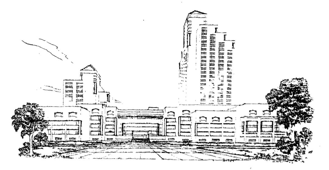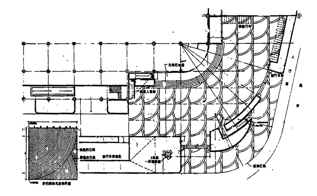上图新馆主要出入口在淮海中路,此处建筑平面作台阶式后退,主出入口退离淮海中路道路红线50米,形成城市开放空间“知识广场”,这种设计在当时是极具超前意识的。考虑到广场上的人车分离、突出主要出入口、增加入口空间层次,在广场中央以高柱廊构架围台成一个26米直径的圆形步行区域,车可从高柱廊外经过。