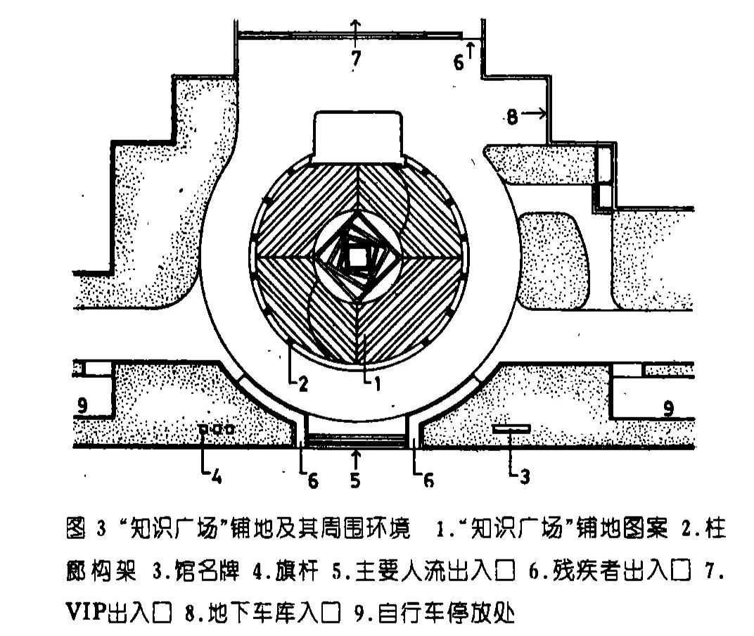 柱廊由12根7米高的长方柱向心围合。高柱廊构架的设置在城市空间中进一步突出了主入口,也通过自身的尺度使广场空间成为建筑与城市之间的过渡,枉廊、曲梁采用与主楼外墙相同的材料,柱子腾空而立,为偏西北向的知识广场增加了光影变化,也平添了文化气息。有内涵的铺地图案新颖别致,在靠人行道一侧有宽阔的台阶、坡道与人行道相连。人们拾级而上进入广场会感受到和谐、素雅的文化氛围。