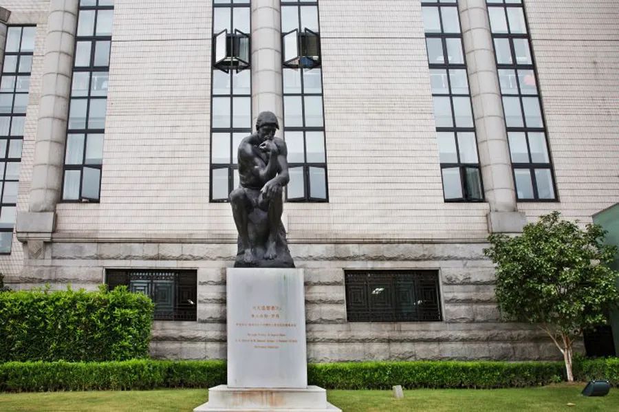 建筑群周围有近万平方米的绿化,营造出都市中难得的宁静。2004年,罗丹“思想者”雕像落户上图新馆外的绿地中,可以说是再合适不过了,阅览室距离窗外的淮海中路达20~50米,加上密闭的隔音窗门,可最大限度地降低室内噪音。