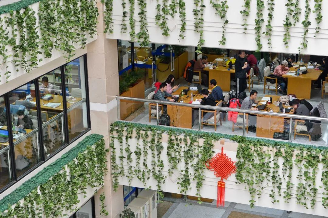 当清晨的一缕阳光透过连接两幢高层的巨大玻璃幕墙,照射到大门厅的磨光花岗石地坪上,人群通过设于淮海中路的大门,经过圆形广场,沿着大楼梯拾级而上。那些带着强烈的求知欲望以及为寻找解决疑难间题答案的人们,穿过大门厅,投入知识殿堂的怀抱。