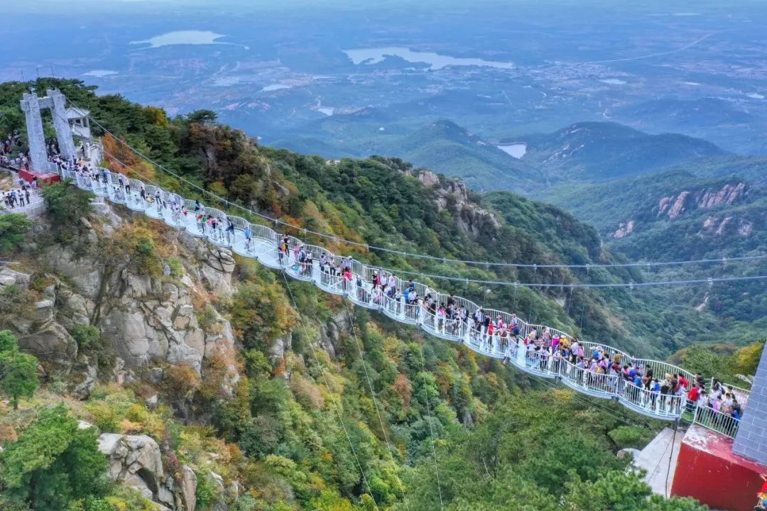 全透明的蒙山玻璃桥横跨峡谷之上,嵌在苍翠欲滴的森林中,放眼望去红黄金绿,绵延的青山都披上了五彩的长裙。