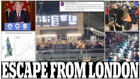 英国《每日邮报》12月19日报道称,在首相宣布防疫等级升级后,不少英国民众抢在“封城”前使用私家车和出租车等工具连夜“逃离伦敦”。近30万居民通过铁路、公路等方式火速“出逃”伦敦。