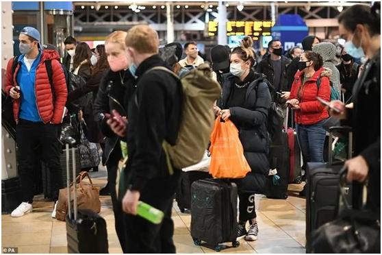 在最高级别疫情防控措施生效前几个小时,伦敦圣潘克拉斯火车站人潮拥挤。