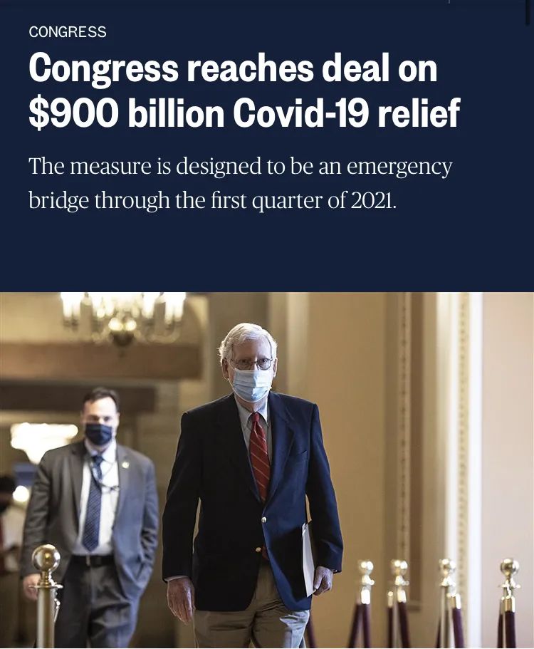 当地时间12月20日,美国参议院多数党领袖米奇·麦康奈尔宣布,美国国会议员已就9000亿美元新冠纾困法案达成协议,为政府提供资金并提供长期的新冠救助。