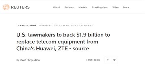 路透社:美国会将批准19亿美元资金,以支持移除华为和中兴电信设备计划。