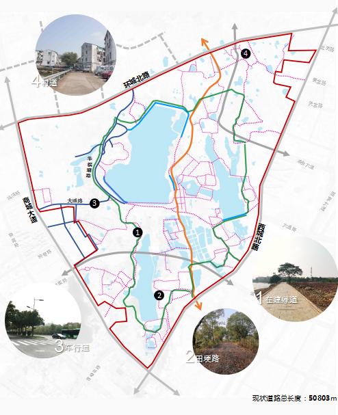 对外交通依托外围城市干道,设置机动车入口2处,人行入口5处,场地内部不通机动车。设置三级游览道路,主园路6米,总长度约13公里。