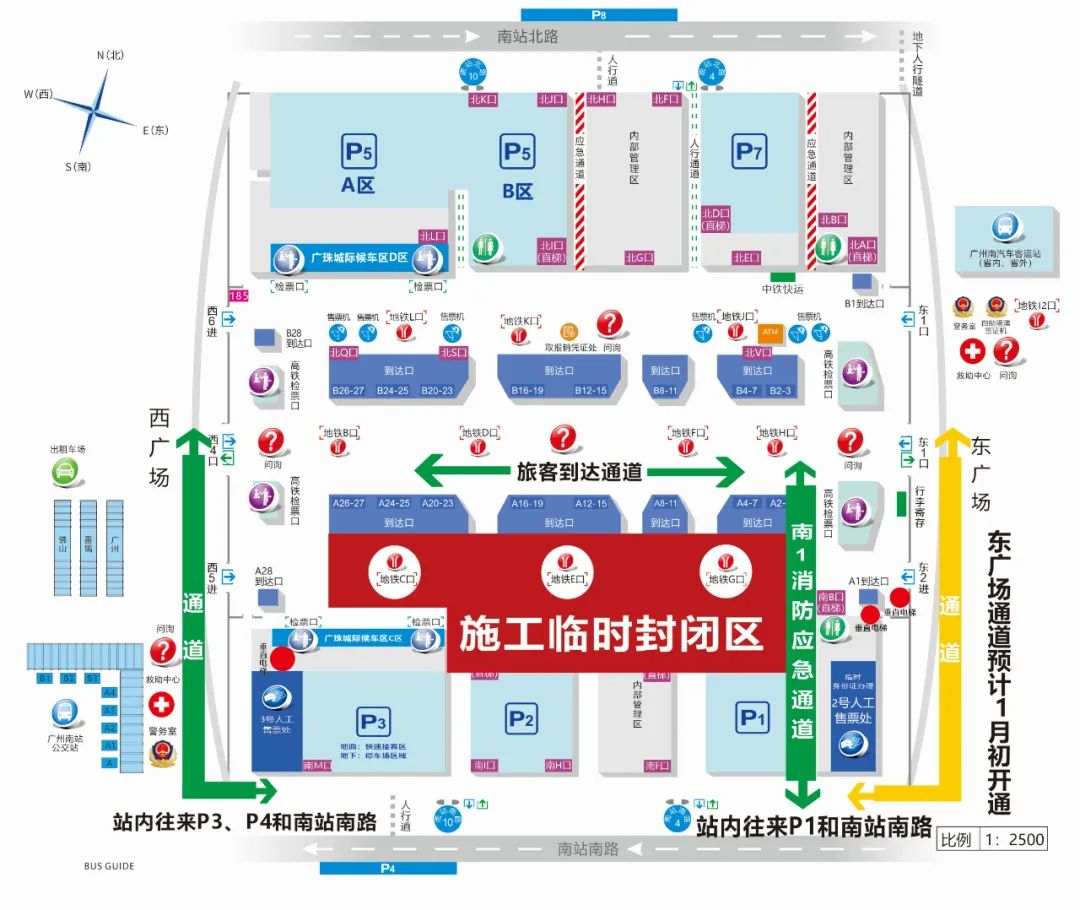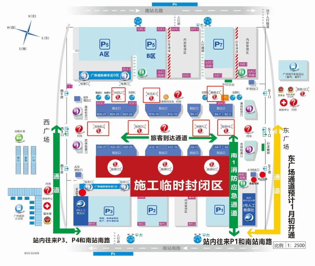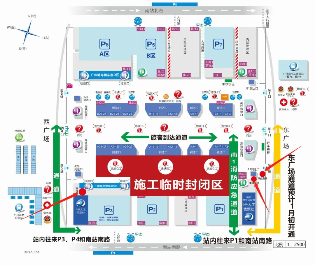 根据铁路部门安排,因广州南站本体改造施工需要,广州南站站内首层南通道于2020年12月21日晚上12点起开始封闭,旅客来往车站与南站南路、P1、P4停车场、P3快速接客区、南面地下停车场的路线将受影响,部分地铁口临时封闭。