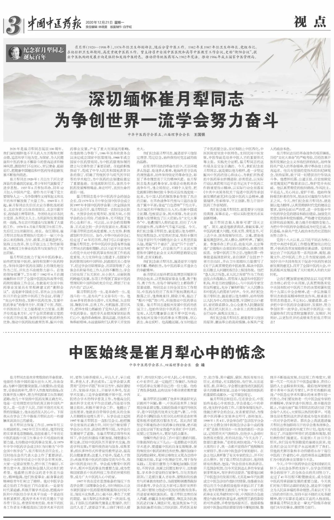 2020 年是崔月犁同志诞辰100 周年。我们深切缅怀他不平凡的人生历程和光辉业绩,追思和学习他为党、为国家、为人民健康和中医药事业不懈奋斗的崇高追求和精神风范,激励我们不忘初心、牢记使命、砥砺前行,把健康中国建设和中医药传承创新发展不断推向前进。