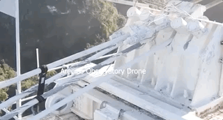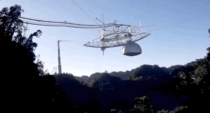然而,还没等到NSF拆除,12月1日早上8点,望远镜的3个支撑塔和支撑钢缆全部断裂。这次的损毁更加彻底——距离底部反射面约137米、重约900吨的仪器平台坠落,阿雷西博射电望远镜自行坍塌了。