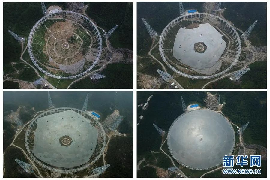 这张拼版照片为FAST项目拼装第一块反射面板(左上,2015年8月2日摄)、面板安装近半(右上,2015年12月16日摄)、面板安装近八成(左下,2016年3月9日摄)、面板安装即将完成(右下,2016年6月29日摄)。图源:欧东衢|新华社