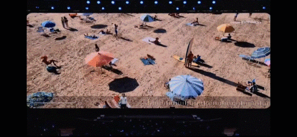 取景框中的画面从遥远的岸边直接拉近到海中央的一座小岛上的一幢建筑,从茫茫人海的海滩全景拉近到一只人群中小狗的特写。