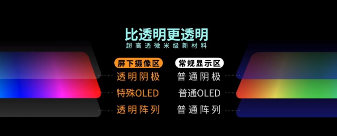 中兴A20所使用的方案,主要是通过使用透明阴极、透明阵列和特殊OLED材料来增加屏幕透光率,并重新规划电路,减少不透光电路的干扰。