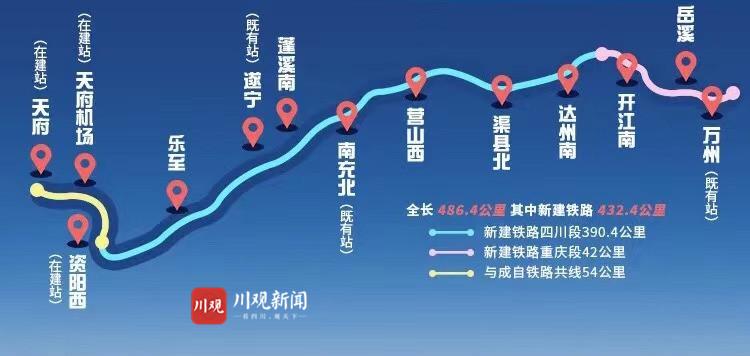 长度:全长486.4公里,其中新建铁路432.4公里(四川段390.4公里,重庆段42公里),与成自铁路共线(天府站至资阳西站)54公里。