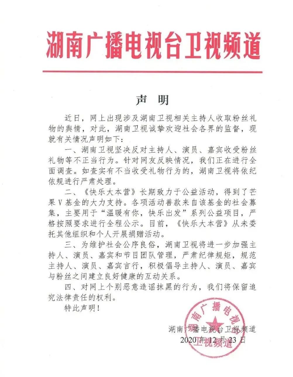 何炅收礼物事件,直接冲上了热搜第一,受到了湖南卫视的重视。12月23日,湖南广播电视台卫视频道发声,坚决反对主持人、演员、嘉宾收受粉丝礼物等不正当行为。针对网友反映情况,正在进行全面调查。如查实有不当收礼物行为的,湖南卫视将依纪依规进行严肃处理。