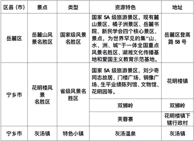 沿途经过岳麓山风景名胜区(麓山景区、橘子洲景区、岳麓书院、新民学会)——花明楼风景名胜区(刘少奇同志故居、门楼广场、铜像广场、生平业绩陈列馆、文物馆、花明园)——灰汤镇(灰汤温泉)3个核心景点。
