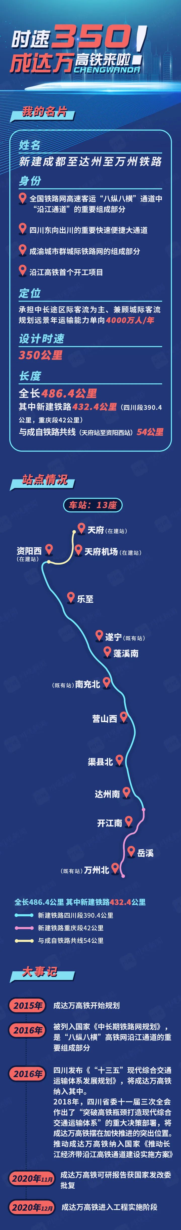 成达万高铁为国家Ⅰ级双线铁路,设计速度350公里/小时,全线设13座车站,新建乐至、蓬溪南、营山西、渠县北、达州南、开江南、岳溪7座车站,引入遂宁、南充北、万州北3座既有车站,利用成自高铁天府、天府机场、资阳西3座在建车站。
