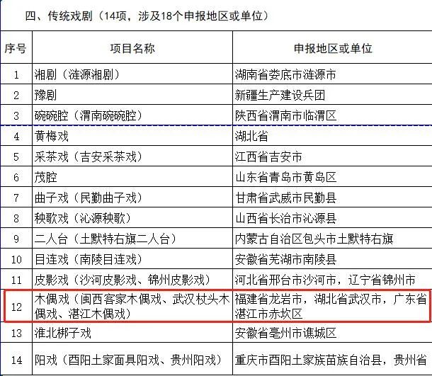 日前,文旅部公示第五批国家级非物质文化遗产代表性项目名录推荐项目名单。名单显示,第五批国家级非物质文化遗产代表性项目推荐项目共337项,含新列入198项,扩展139项。其中,由湛江市赤坎区申报的湛江木偶戏被列入扩展项目的“传统戏剧”的推荐名单。