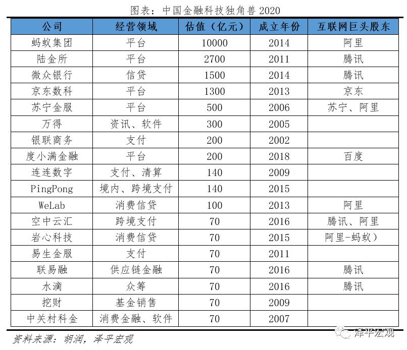 分企业看,中国金融科技市场格局寡头化。不同于其他国家和地区金融科技以中小型公司为主,中国金融科技市场结构趋向少数大型企业主导。《2020胡润全球独角兽榜》显示,18家金融科技行业独角兽企业估值共计16340亿元。