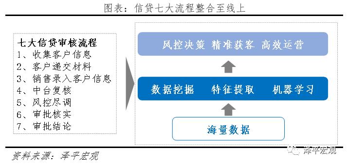 在普通中小企业贷款中,银行通过金融科技技术采集电商交易、物流、企业结算、流水等数据,结合工商、税务、法院等外部信息,一并进入数据湖,经数据挖掘、特征提取、机器学习等方式刻画企业形象,进而构建信用模型、判断信用风险、核定信用额度,完成企业到企业主的全面分析,实现线上审批、自动放款。金融科技中数据的获取、加工、分析等是并行操作,将七大原有信贷审核流程整合为一体,提升审批效率、降低运营成本。